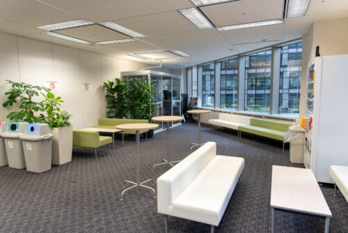 ホワイエには、会議の合間にくつろげるソファーや簡易ミーティングスペース、自販機・喫煙所といったリフレッシュ設備が充実しています。
