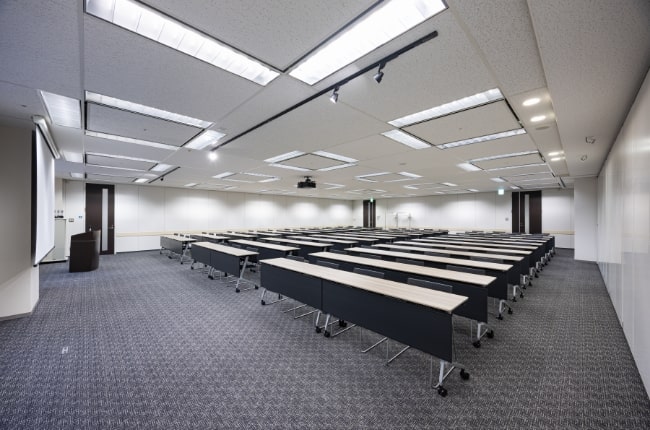 【備品】会議机×66、会議椅子×132、ホワイトボード×2、演台×1、ワイヤレスハンドマイク×4、天吊スクリーン(プロジェクター有料)×1、インターネット回線×1